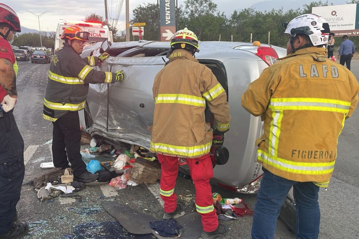La Unidad de Protección Civil de Nuevo León atendió la tarde de este sábado un reporte por la volcadura de un vehículo en el kilómetro correspondiente al cruce de Camino a Los Galemes y la Carretera Nacional, en la comunidad de Las Palmas, en el municipio de Santiago.