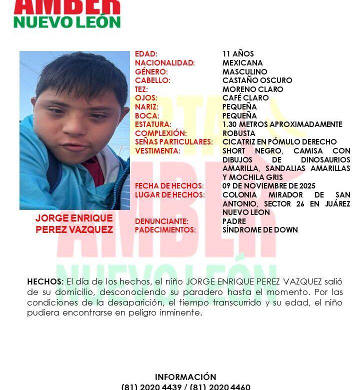 La Agencia Estatal de Investigaciones de Nuevo León activó una Alerta Amber para localizar a Jorge Enrique Pérez Vázquez, un niño de 11 años de edad que fue visto por última vez el pasado 9 de noviembre de 2025 en la Colonia Mirador de San Antonio, sector 26, en el municipio de Juárez, Nuevo León.