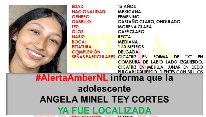 La Fiscalía General de Justicia de Nuevo León informó que Angela Minel Tey Cortes, adolescente de 15 años reportada como desaparecida en el municipio de Guadalupe, fue localizada en aparente buen estado de salud, a reserva de una valoración médica.
