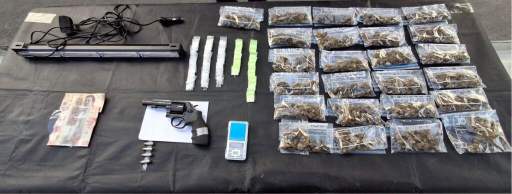 Al interceptarlo, los individuos se identificaron como Antonio “N”, de 51 años, y Bryant “N”, de 23. Durante la inspección preventiva, se les aseguró un arma corta abastecida, además de 39 dosis de una sustancia sólida con características de cristal, 20 envoltorios con polvo blanco similar a la cocaína y 20 dosis de hierba verde seca, presumiblemente marihuana.