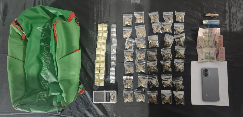 El joven se identificó como Raúl “N”, de 18 años de edad. Tras solicitarle autorización para una revisión precautoria, los agentes localizaron entre sus pertenencias un cigarrillo artesanal con hierba verde y seca con características similares a la marihuana, así como 35 bolsas tipo ziploc con el mismo enervante, 20 bolsas con una sustancia granulada cristalina presuntamente cristal y 11 envoltorios con una sustancia sólida blanca con apariencia de cocaína en piedra.