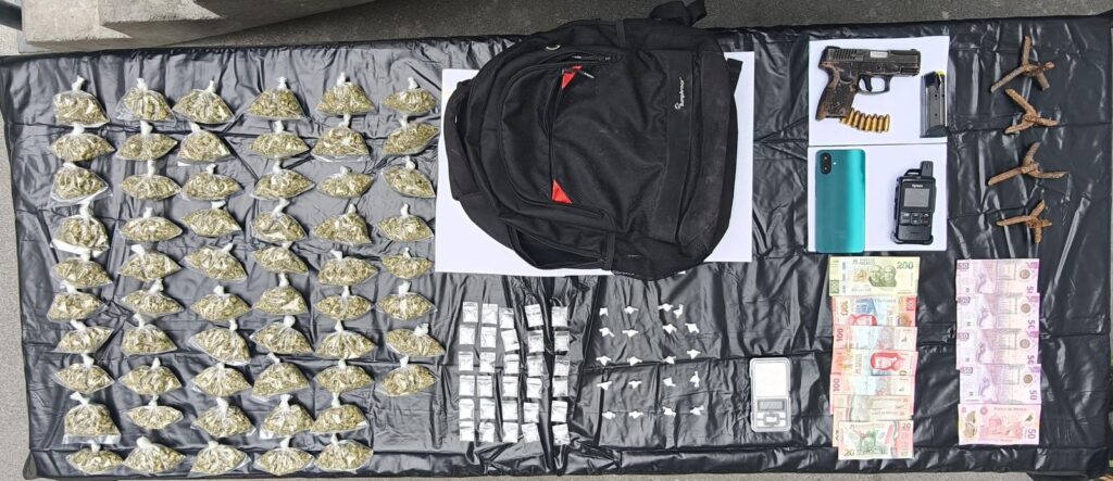 Al verse sorprendidos, los individuos intentaron huir, pero las autoridades lograron detener a José “N”, de 38 años. Entre sus pertenencias se encontraron: un arma corta con ocho balas, 58 envoltorios con marihuana, 30 dosis de una sustancia similar al cristal, 20 dosis de droga parecida a la cocaína en piedra, un radio, cuatro ponchallantas, dispositivos de comunicación y herramientas de pesaje.
