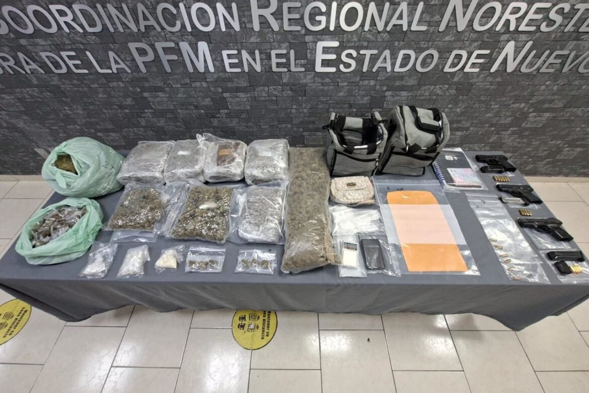 Durante la diligencia, agentes de la Policía Federal Ministerial recorrieron el inmueble y localizaron tres armas de fuego, 20 cartuchos, tres cargadores y una cantidad considerable de narcóticos. Entre lo asegurado se contabilizaron más de ocho kilos de marihuana, más de nueve kilos de cocaína en polvo y una porción adicional de cocaína en piedra. Además, se decomisó equipo empleado para el pesaje y empaque del estupefaciente, indicio de posible actividad de distribución.