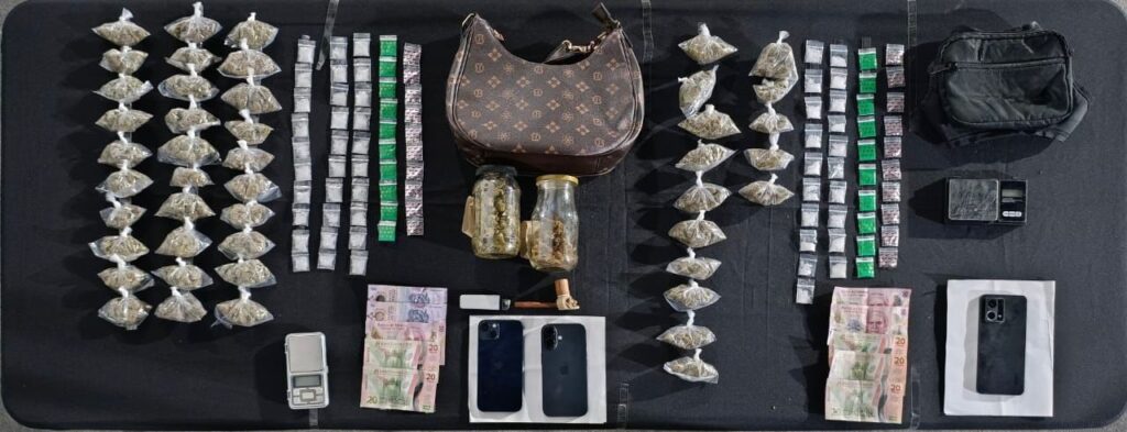 Al realizarles una revisión preventiva, se les decomisaron varios envoltorios con distintos tipos de droga: 30 con hierba verde similar a la marihuana, 50 con una sustancia sólida con características de cristal, 20 con una sustancia que parecía cocaína en piedra y otros 20 con polvo blanco presuntamente cocaína, además de otros indicios ilícitos.