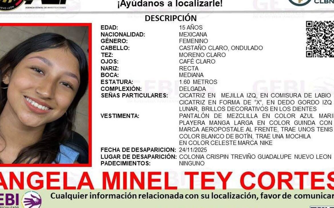 La Fiscalía General de Justicia de Nuevo León emitió una Alerta Amber para solicitar el apoyo de la ciudadanía en la búsqueda de Angela Minel Tey Cortes, una adolescente de 15 años cuya desaparición fue reportada en el municipio de Guadalupe.