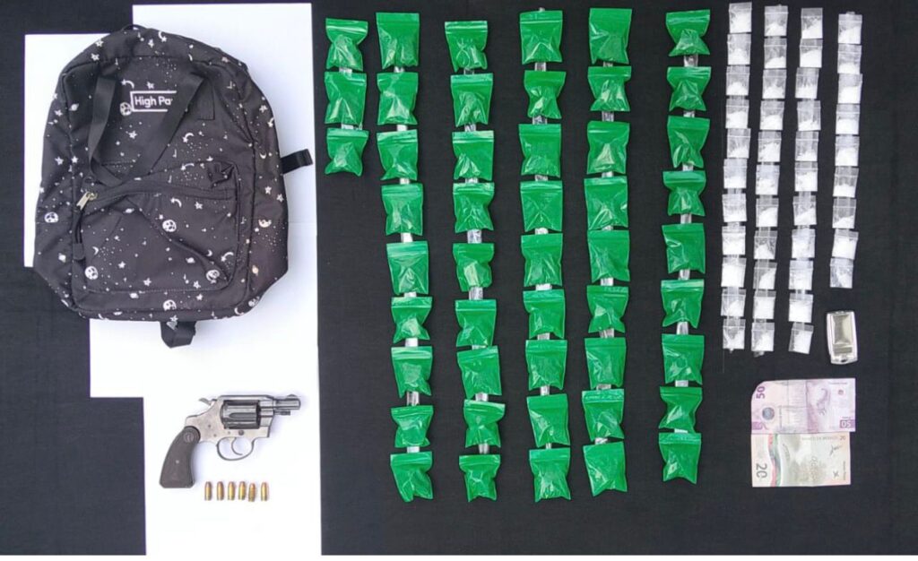 El individuo, identificado como Mario “N”, de 27 años, llevaba consigo un revólver con seis cartuchos útiles, además de 48 envoltorios con hierba verde y seca con características de marihuana, y 42 dosis de una sustancia sólida similar al cristal, así como otros objetos presuntamente ilegales.