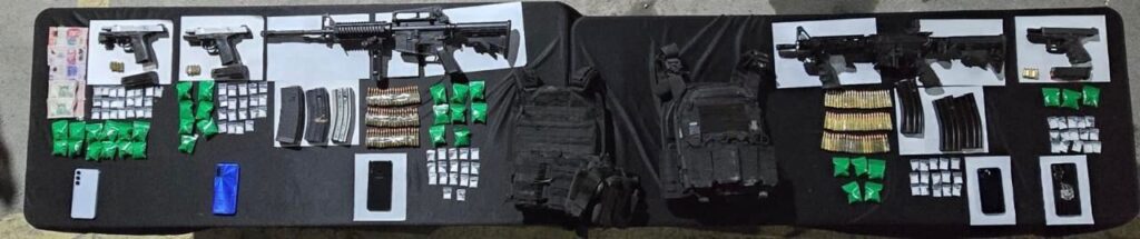 Los detenidos fueron identificados como Jaziel “N”, Juan “N”, Fernando “N”, Edson “N” y José “N”, cuyas edades oscilan entre los 21 y 33 años. Durante la revisión se les decomisaron armas cortas y largas, cartuchos útiles, cargadores, chalecos balísticos, así como envoltorios con hierba verde seca y dosis de una sustancia con características del cristal.