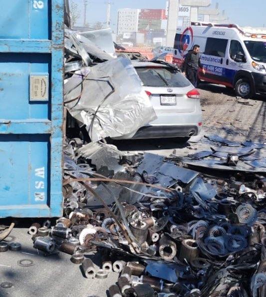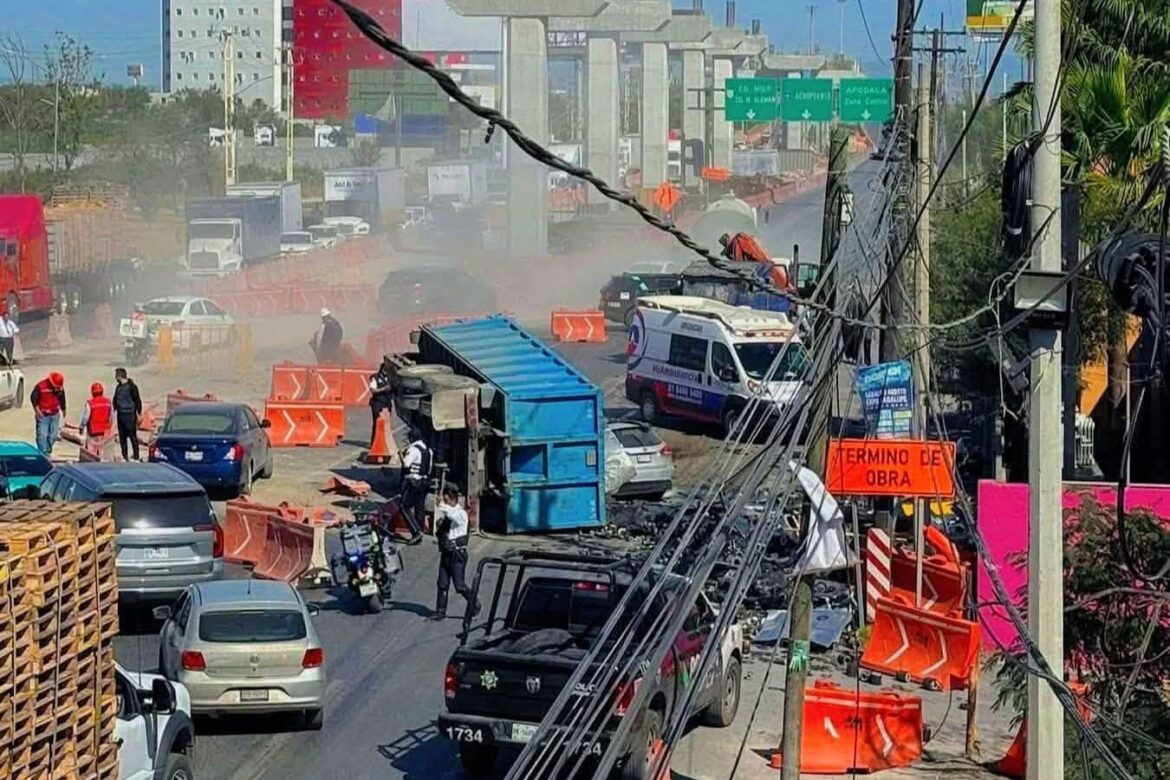 Según información de Protección Civil de Nuevo León, el vehículo pesado aparentemente se quedó sin frenos y terminó impactando a cinco automóviles antes de volcarse. Tres personas sufrieron lesiones de diversa consideración y recibieron atención médica en el lugar.