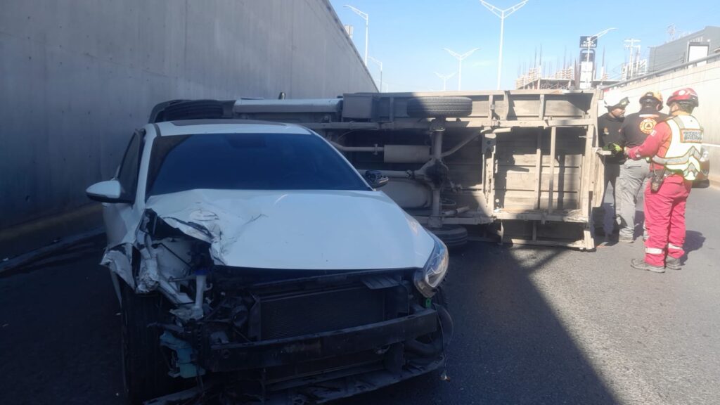 Un accidente vial tipo volcadura se registró este viernes en el cruce de las avenidas Paseo de los Leones y Paseo de los Insurgentes, en la colonia Cumbres 1, al poniente de Monterrey.