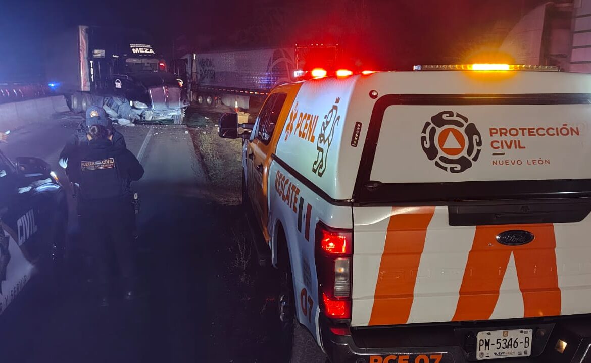 Derivado del choque, el tanque de la unidad presentó una fuga de diésel. Elementos de Bomberos de Nuevo León llevaron a cabo trabajos para contener el combustible utilizando material absorbente, con el fin de prevenir algún riesgo mayor para automovilistas y personal operativo.