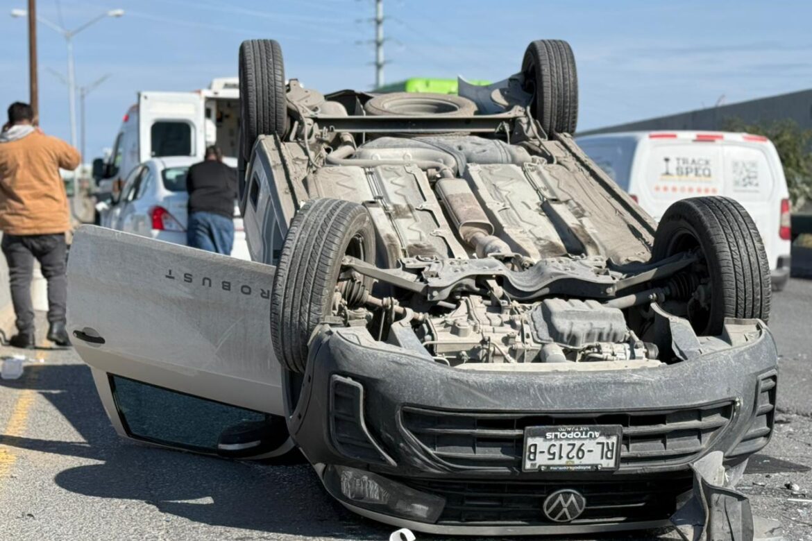 Un accidente vial registrado en la intersección de Miguel Alemán y Ruiz Cortinez, en la colonia Nueva Linda Vista, provocó la volcadura de un vehículo tras un choque con otro automóvil particular.