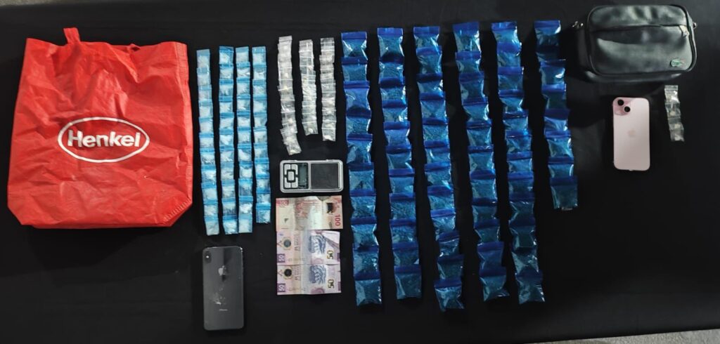 En la revisión del automóvil y de sus pertenencias, los elementos aseguraron 64 bolsas con hierba verde y seca con características similares a la marihuana, así como 37 dosis de una sustancia sólida parecida a la cocaína en piedra y 44 dosis de una sustancia granulada con apariencia de cristal.