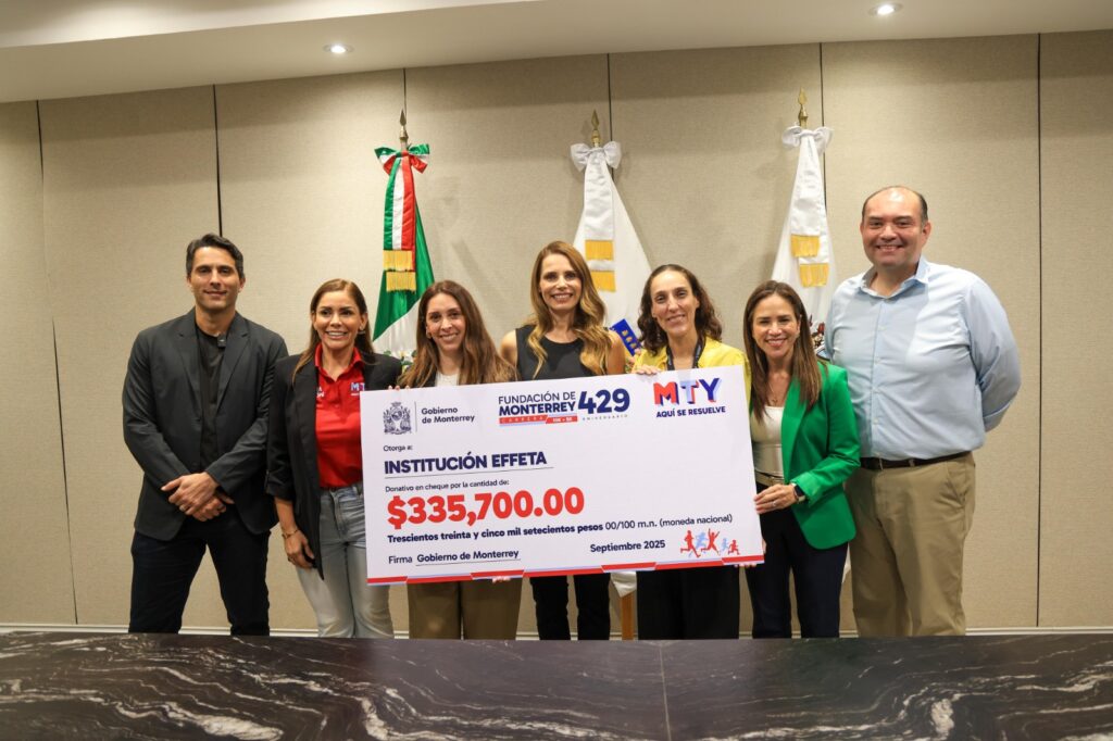 La institución EFFETA, dedicada a la atención de personas con discapacidad intelectual, recibió este miércoles un importante donativo económico de 335 mil 700 pesos por parte del Gobierno de Monterrey, recursos que fueron recaudados durante la carrera atlética realizada por el 429 aniversario de la ciudad.