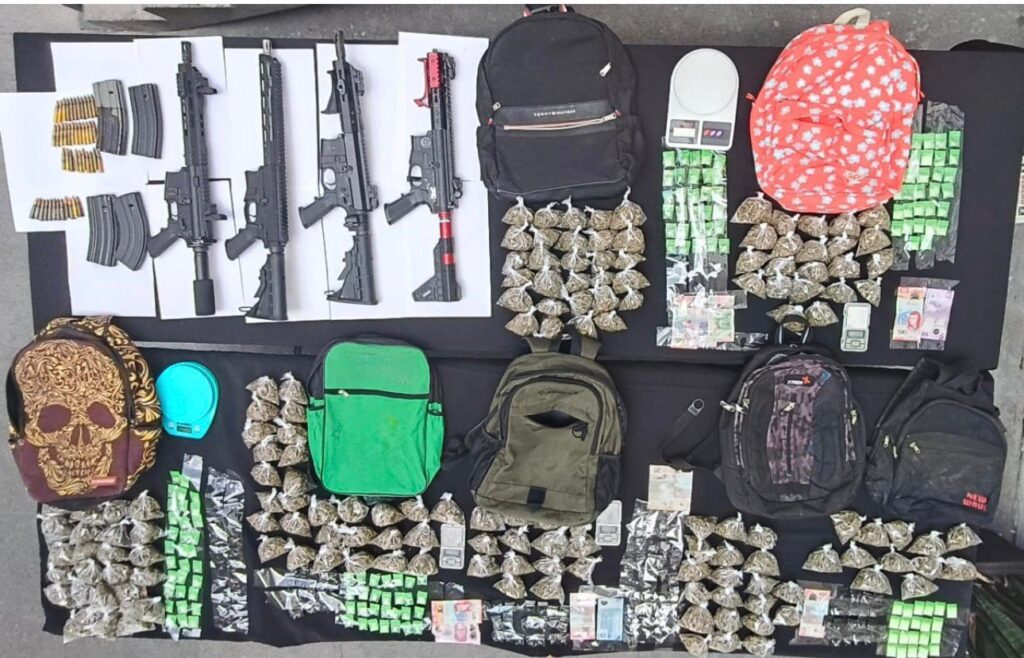 En una revisión precautoria de sus pertenencias, las autoridades localizaron cuatro armas largas abastecidas con 46 balas, 26 dosis de polvo blanco similar a la cocaína, 151 envoltorios con hierba verde y seca con características de marihuana, 114 dosis de una sustancia sólida parecida al cristal y 118 dosis de una sustancia sólida parecida a la cocaína en piedra.