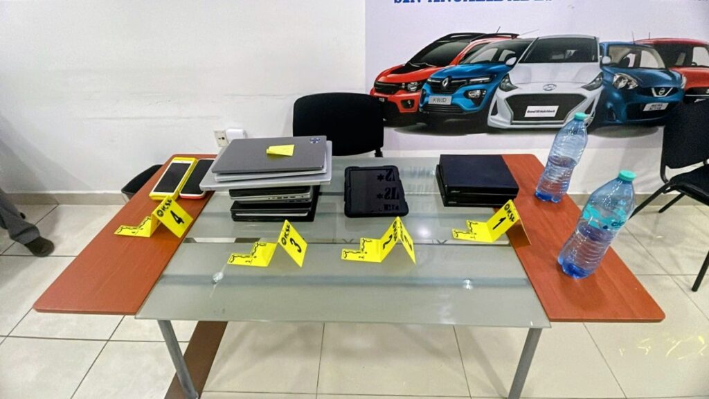 En el Punto 3, situado en la avenida Pablo Livas, en la colonia Gustavo Díaz Ordaz de Guadalupe, fueron encontrados ocho laptops, cuatro iPads, un CPU, una terminal bancaria, un DVR, documentos y teléfonos celulares.