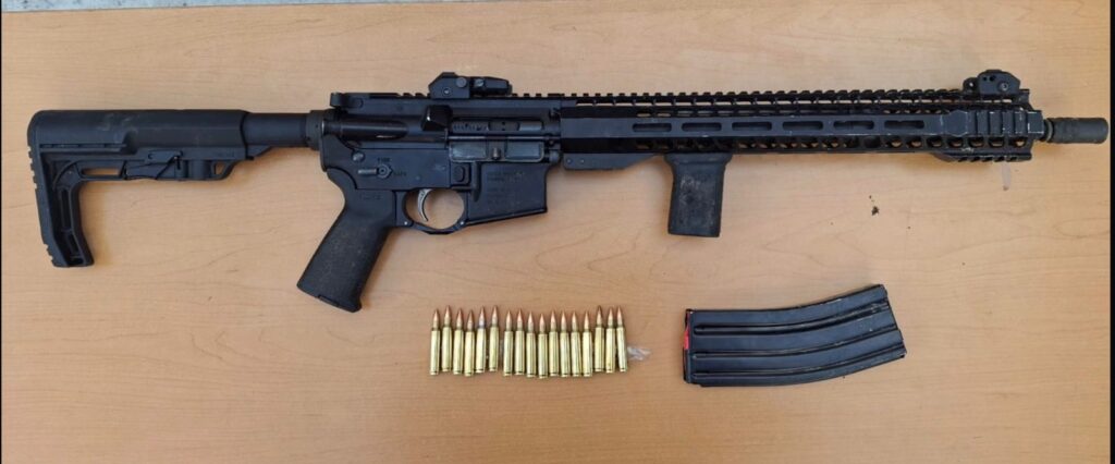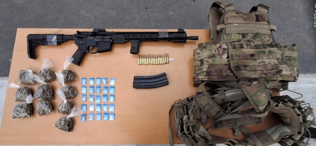 El detenido fue identificado como Néstor “N”, de 34 años de edad. Durante la detención, se le aseguraron diversos objetos, entre ellos un arma larga con 14 cartuchos útiles, una fornitura con porta cargadores, un chaleco táctico, además de 10 envoltorios con hierba seca con las características de la marihuana y 25 dosis de una sustancia con apariencia de cristal.