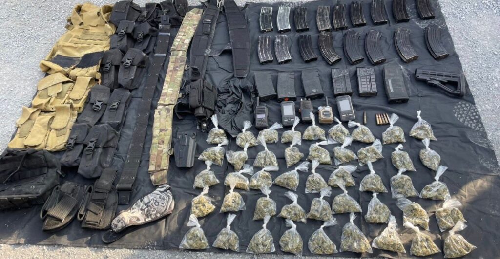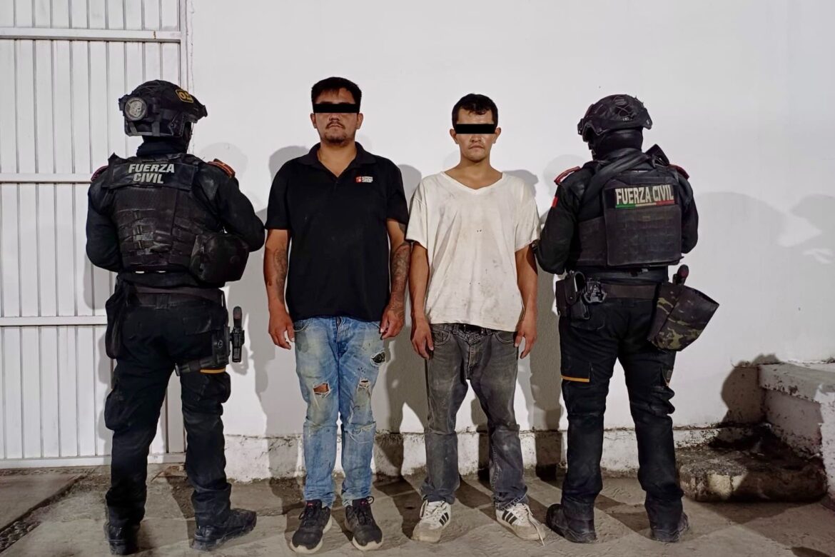 Al detener la unidad, los agentes identificaron a los ocupantes como César “N”, de 28 años, y Brandon “N”, de 26. Tras una revisión, Fuerza Civil aseguró una serie de artículos considerados de uso táctico y posible equipo para armamento.