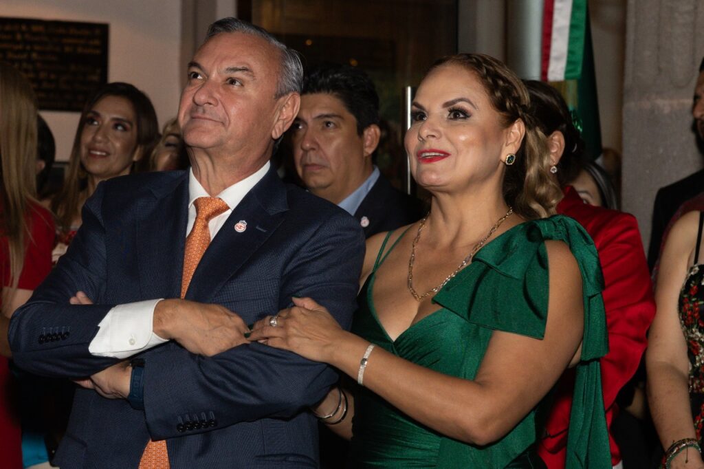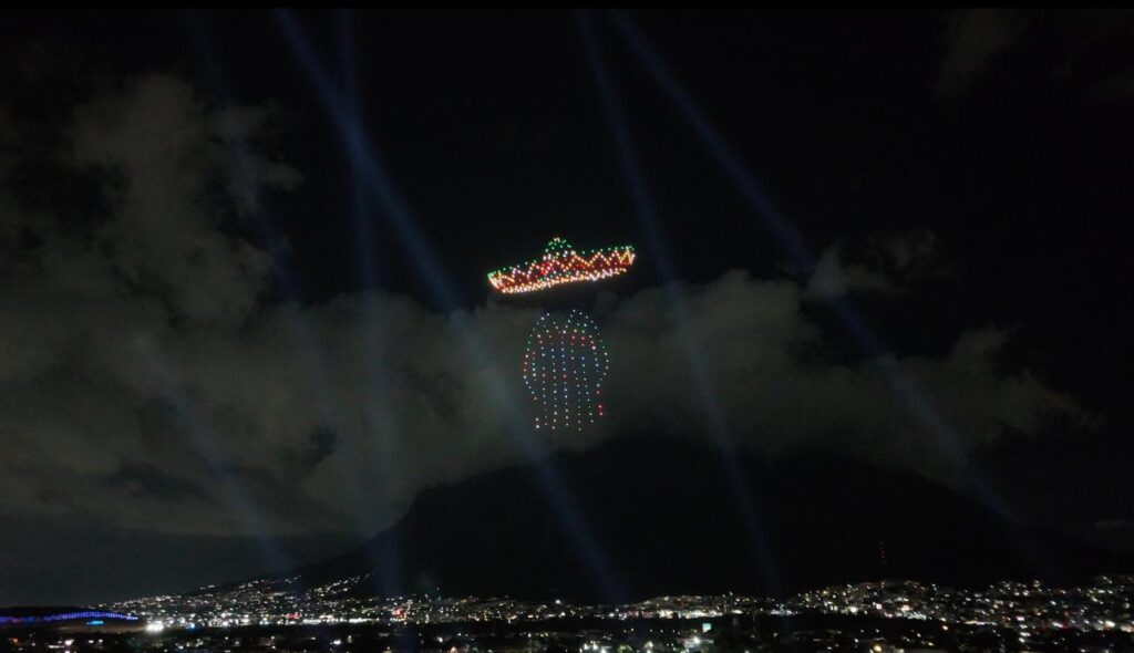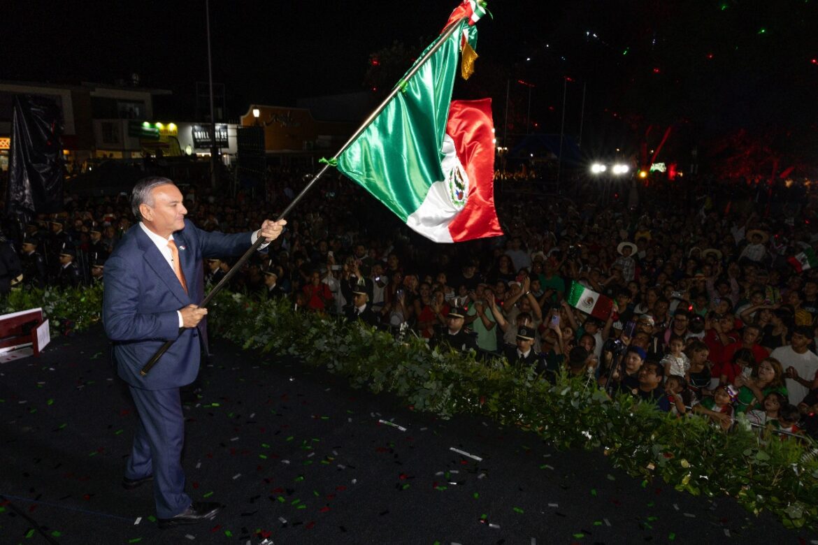 Un cielo iluminado por un show de drones dio inicio a la fiesta. Mientras las figuras de luz se movían sobre la plaza, miles de voces se unieron al ¡Viva México! del edil, acompañado por el repicar de la campana y el ondear de la Bandera Nacional. La escena combinó historia y modernidad, recordando la independencia de México hace 215 años.