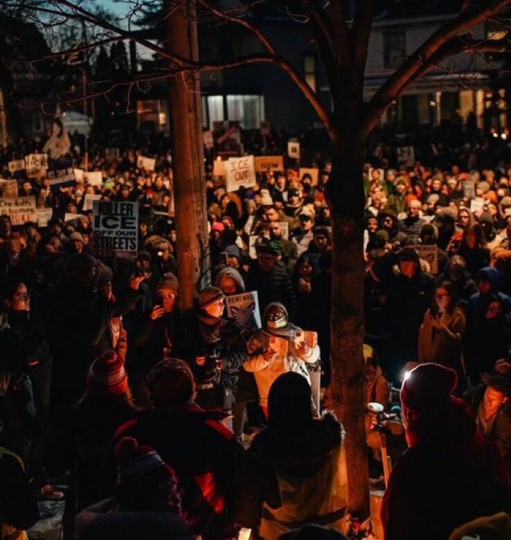 Horas después del tiroteo, cientos de personas realizaron una vigilia en memoria de Macklin Good. Aunque inicialmente fue pacífica, más tarde multitudes marcharon por la ciudad, coreando consignas como “ICE fuera de Minnesota” y utilizando silbatos, símbolo recurrente en protestas contra redadas migratorias.