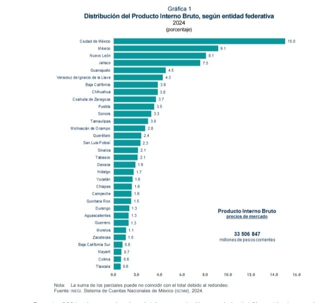 El Instituto señala que en 2024 el PIB por entidad federativa fue de 33 millones 506 mil 847 millones de pesos.