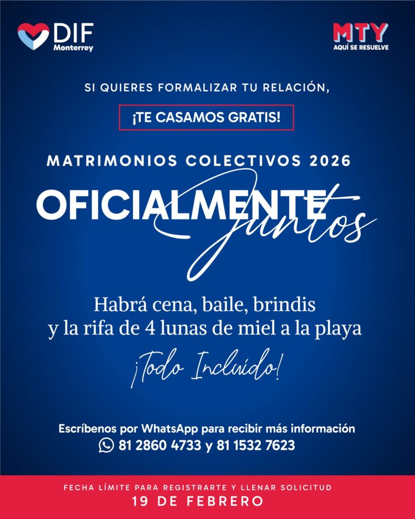 Las parejas interesadas en contraer matrimonio civil sin costo podrán hacerlo a través del programa “Oficialmente Juntos”, mediante el cual el DIF Monterrey organizará matrimonios colectivos gratuitos como parte de las actividades del mes del Amor y la Amistad.