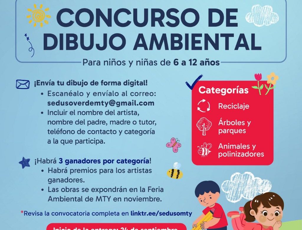 Por su parte, el Concurso de Dibujo Ambiental Infantil está enfocado en niñas y niños de 6 a 12 años. Las categorías son reciclaje, árboles y parques de Monterrey, y animales y polinizadores. Los participantes deberán enviar sus dibujos escaneados al correo de la Dirección para un Desarrollo Verde. También en este concurso habrá nueve ganadores que recibirán reconocimiento y cuyas obras serán expuestas en la feria ambiental.