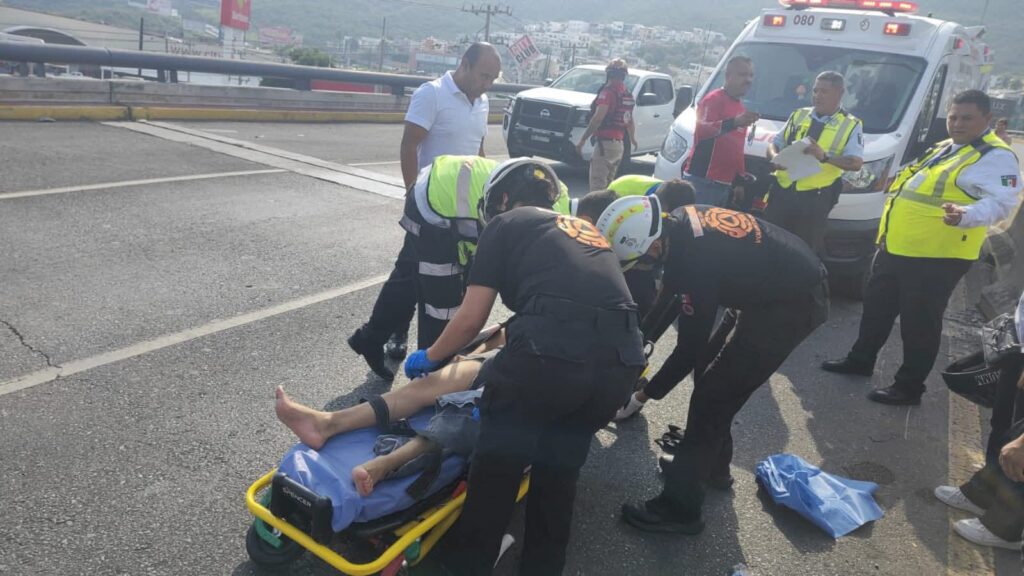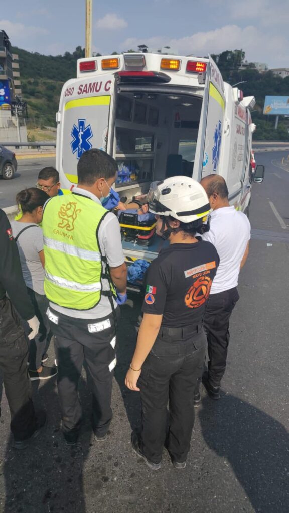 Arturo Cruz Flores sufrió una probable fractura en la rótula tras perder el control de su motocicleta Italika sin placas. Personal de la Unidad de Protección Civil de Nuevo León llegó al sitio alrededor de las 14:22 horas para brindar atención médica inmediata y valorar al lesionado. Más tarde, Cruz Flores fue trasladado por una ambulancia del CRUM al Hospital General de Zona No. 21 del IMSS.