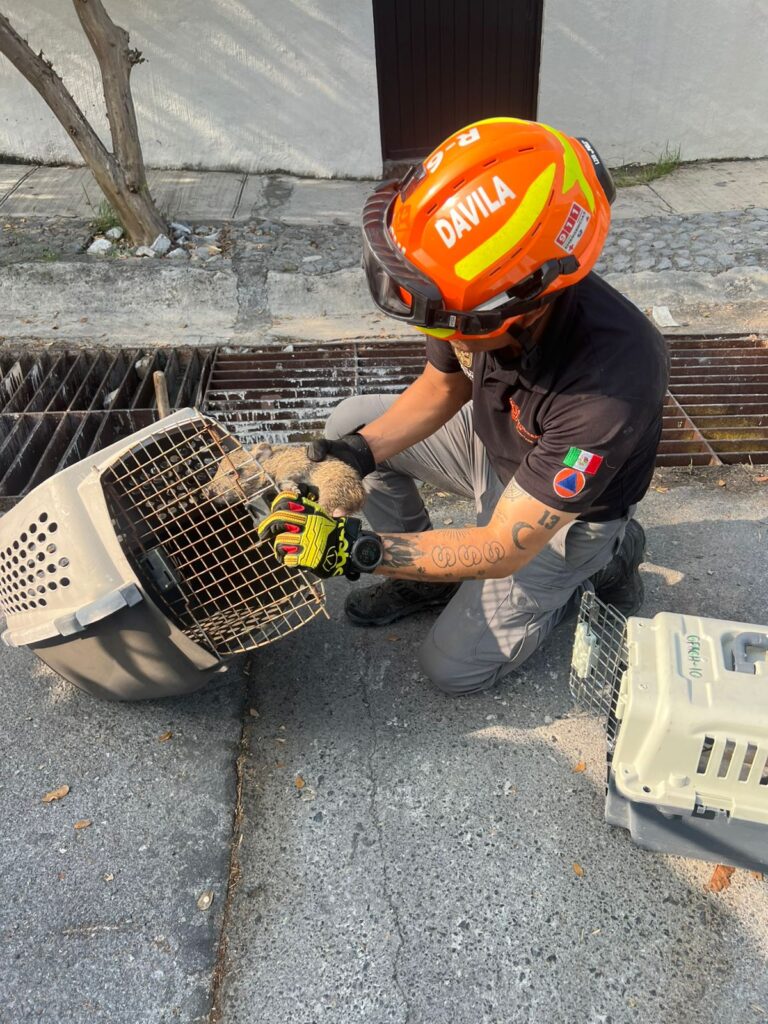 Durante la inspección del área, los rescatistas detectaron además una cría de aproximadamente un mes atrapada dentro de una alcantarilla. Para liberarla, fue necesario utilizar equipo hidráulico y abrir la estructura, logrando extraer al pequeño animal sin afectaciones.