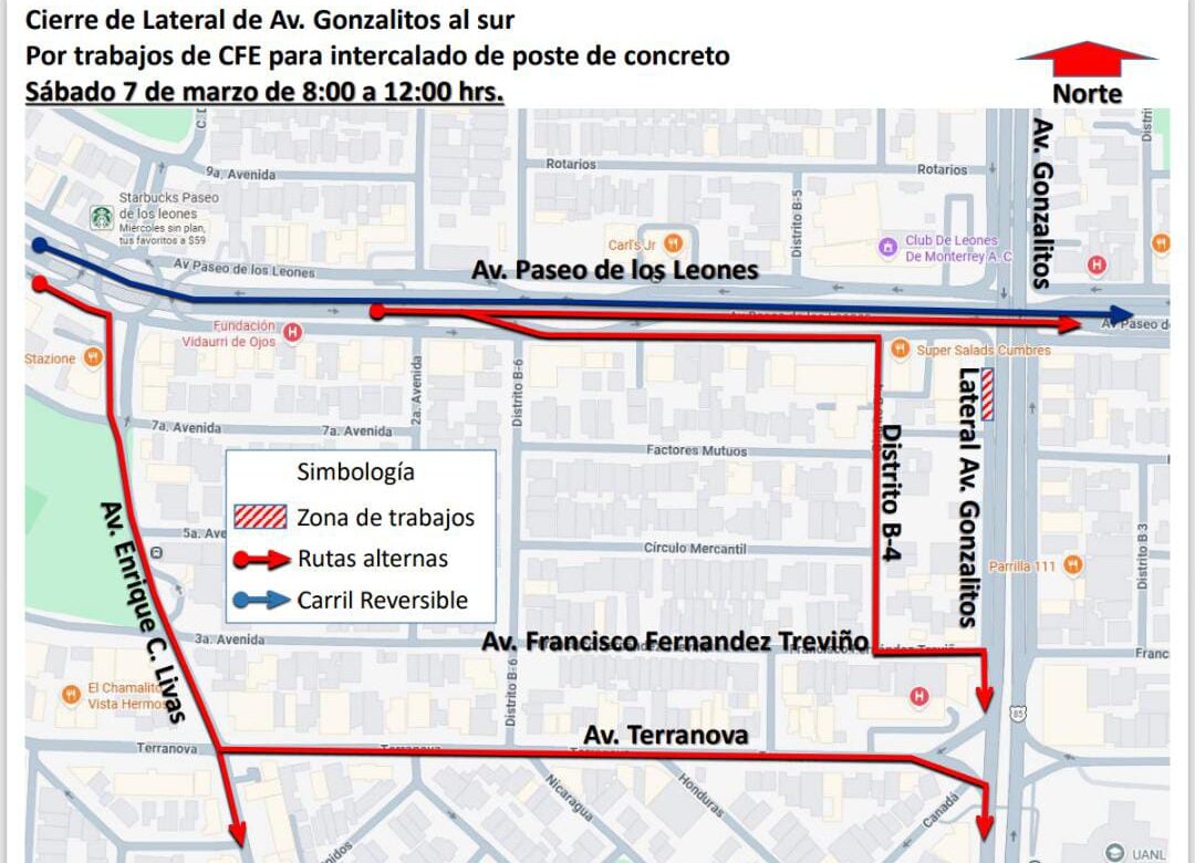 Monterrey, NL. — Este sábado, parte de la avenida Gonzalitos permanecerá cerrada temporalmente debido a trabajos de la Comisión Federal de Electricidad (CFE). Las labores consisten en intercalar postes de concreto, por lo que se restringirá la circulación en el carril lateral que conecta Paseo de los Leones con Gonzalitos en dirección norte-sur.