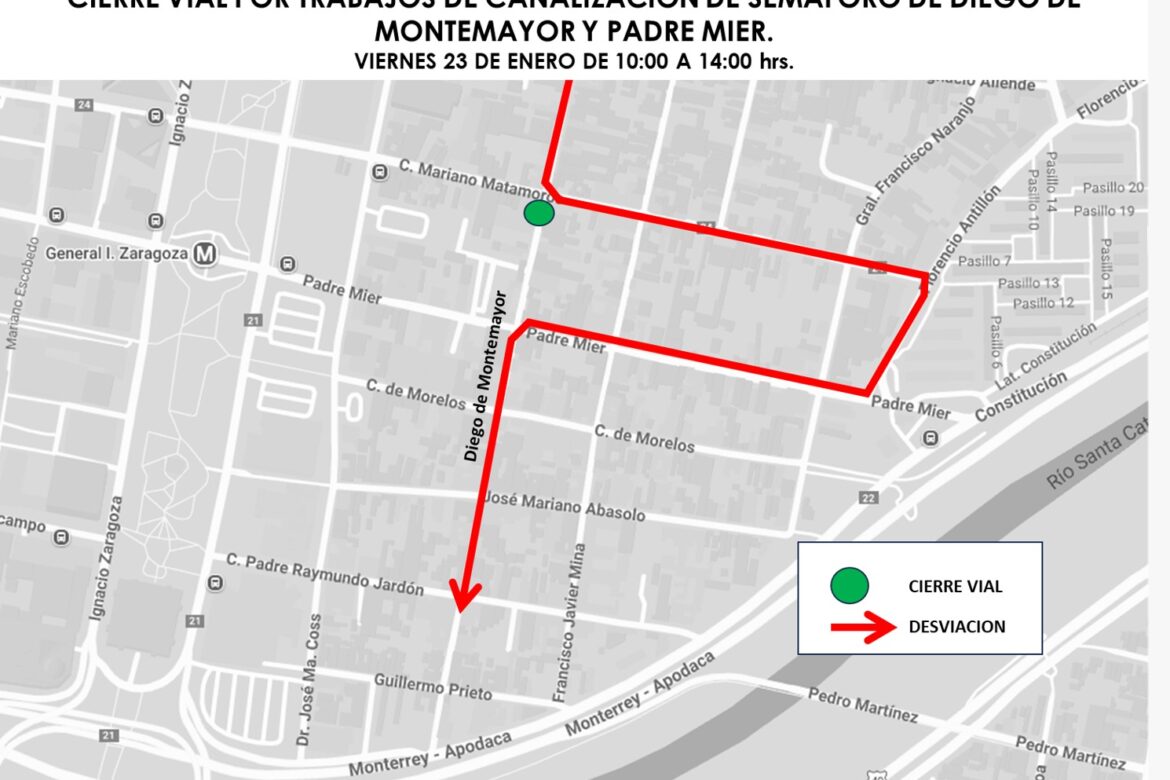 La interrupción del tránsito será de 10:00 a 14:00 horas, tiempo durante el cual se realizarán trabajos de canalización y actualización del semáforo en la intersección con Padre Mier.