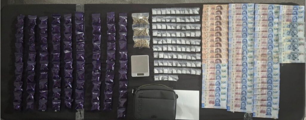 El detenido fue identificado como Abraham “N”, de 26 años. En la revisión, los agentes encontraron 94 bolsas tipo ziploc con hierba verde y seca, presuntamente marihuana; así como 95 dosis de una sustancia sólida con apariencia de cristal. Además, llevaba consigo 34 mil pesos cuya procedencia legal no pudo justificar.