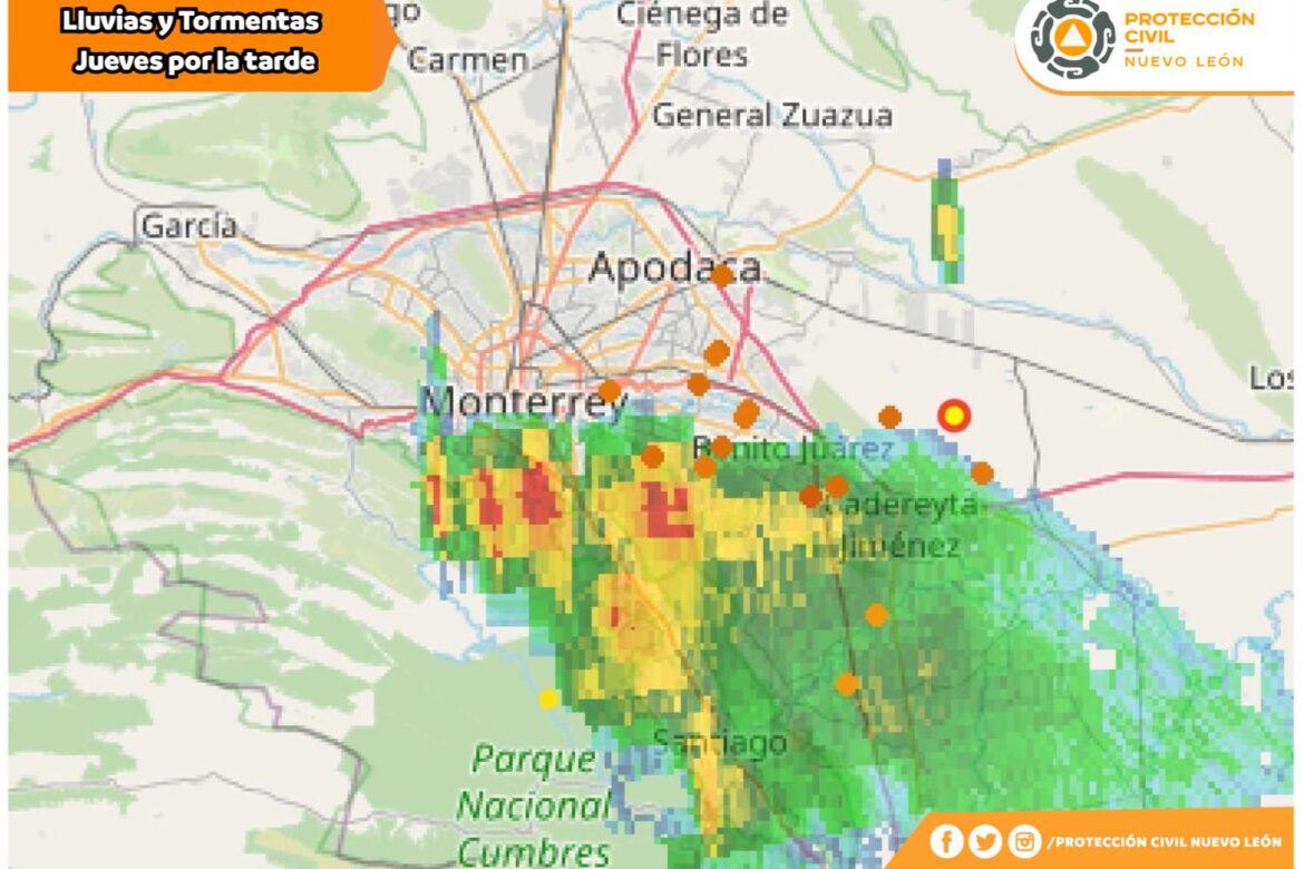 La tarde de este jueves ha estado marcada por lluvias intensas y actividad eléctrica en varias zonas del estado. Protección Civil de Nuevo León informó que un núcleo de precipitaciones, ubicado en las áreas montañosas y citrícolas, se desplaza actualmente hacia la zona metropolitana.