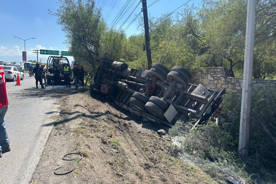 30 de agosto de 2025. — Esta tarde, un tráiler cargado con catorce toneladas de cemento sufrió un accidente sobre la Carretera a Laredo, justo frente a la 7ª Zona Militar, quedando recostado fuera de la carpeta asfáltica.