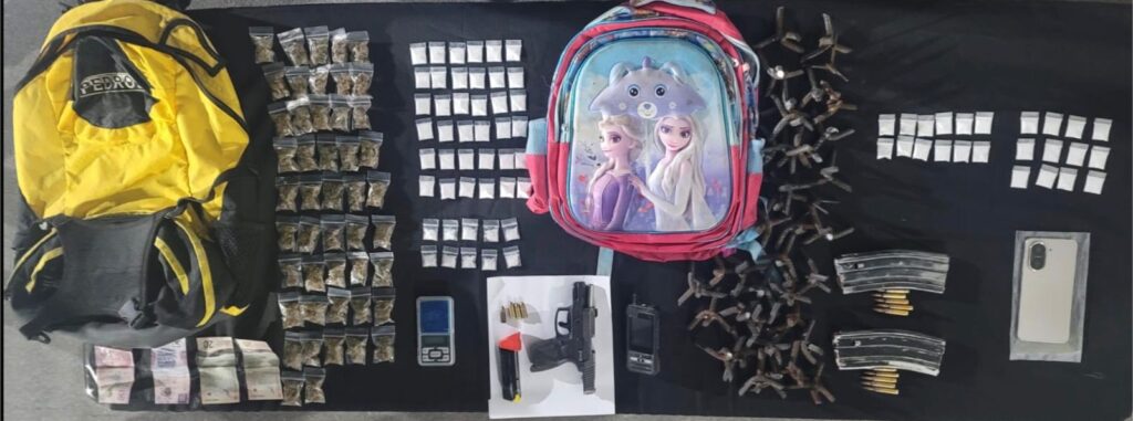 Tras un operativo de búsqueda en la zona de maleza, los elementos detuvieron a Luis N., de 48 años, Mía, de 19, y Heydi, de 20. Durante la inspección precautoria, se aseguraron: un arma corta, tres cargadores, 14 cartuchos hábiles, 39 objetos metálicos conocidos como “ponchallantas”, una radiofrecuencia, 47 envoltorios con marihuana, 60 bolsas con cocaína en polvo, 10 envoltorios con cristal, una báscula, un celular y dinero en efectivo.