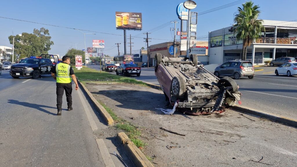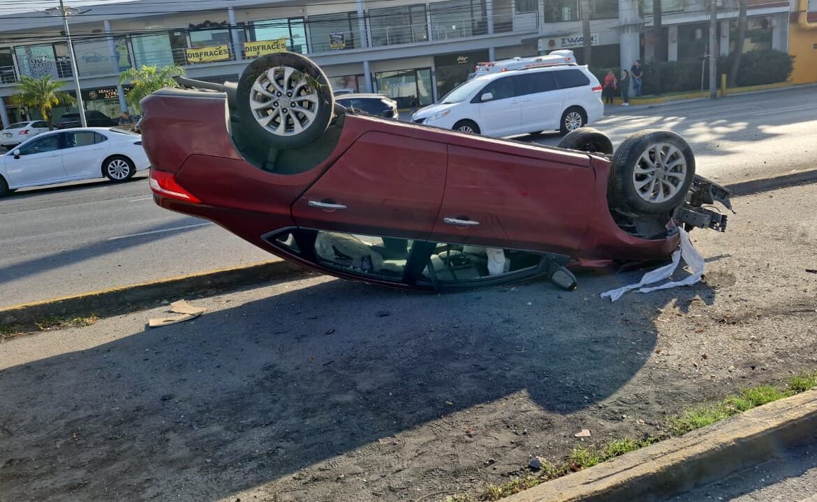 La circulación se vio afectada en el cruce de la avenida Revolución y Camino a Guadalupe, en la colonia Jardines del Contry, luego de que un automóvil particular terminara volcado y causara daños a la infraestructura urbana.